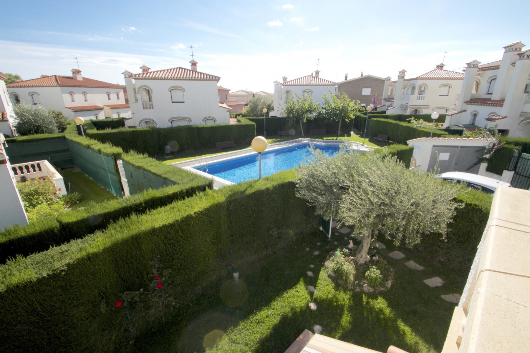 La casa tiene un jardín privado, cómodo y tranquilo, con acceso directo a una amplia zona común con jardín y gran piscina rectangular.