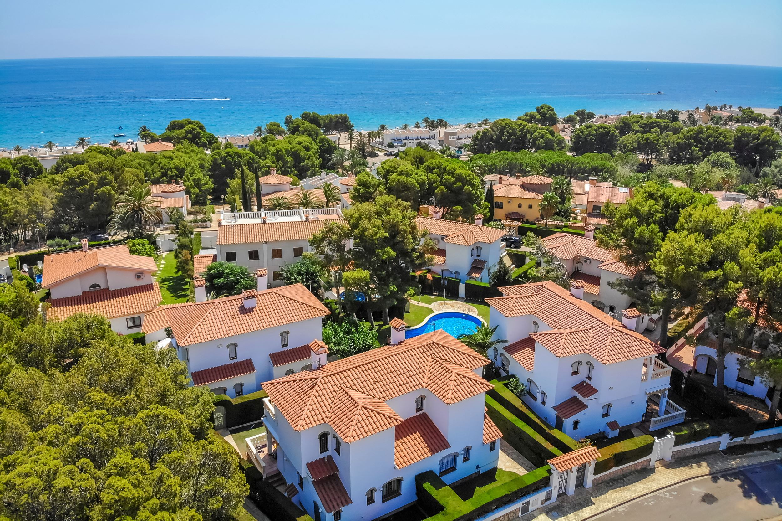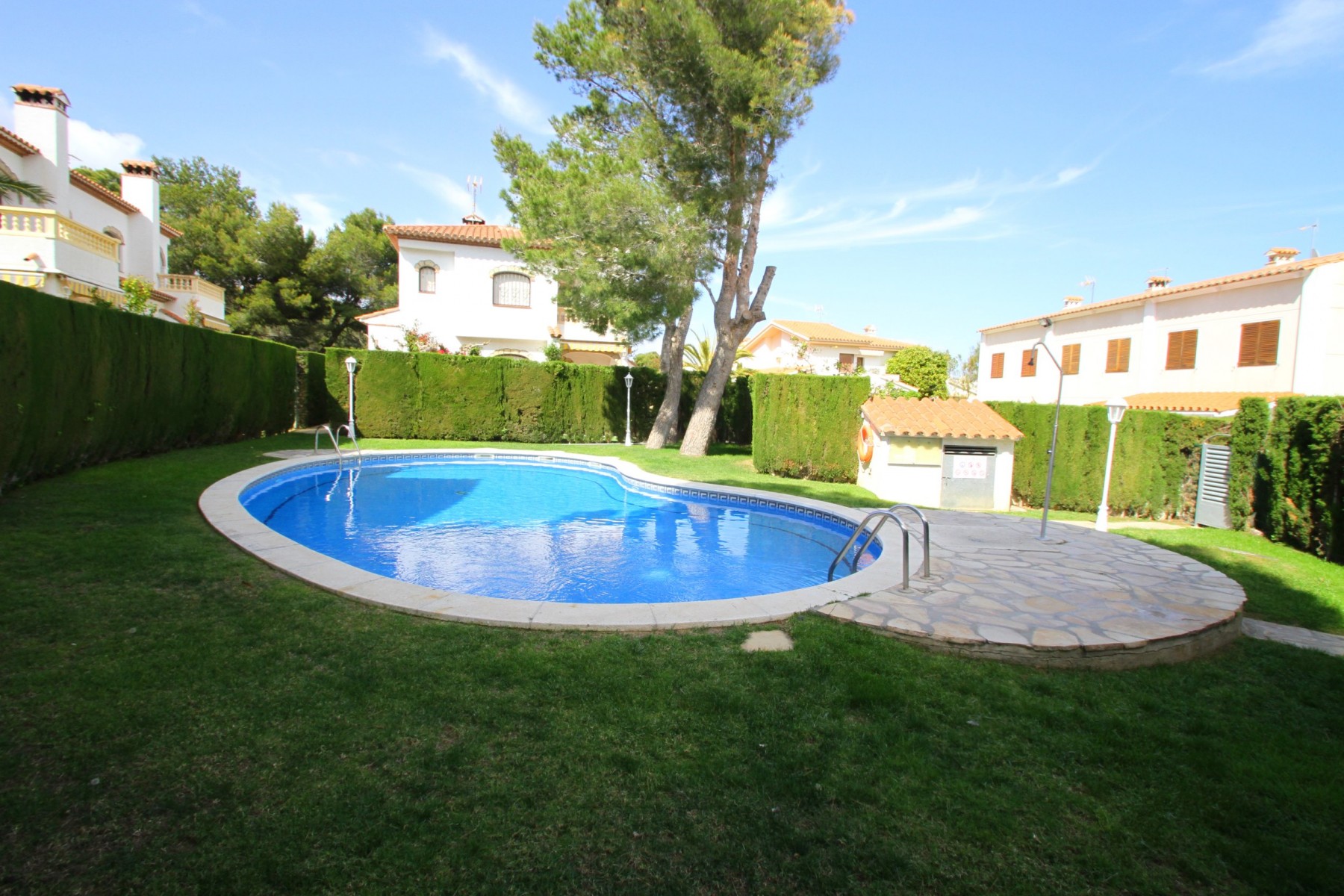 La casa es esquinera y dispone de un jardín privado muy íntimo con césped, árboles y zona privada de barbacoa. Desde el jardín privado accedemos a una tranquila zona comunitaria con una piscina para 10 casas.