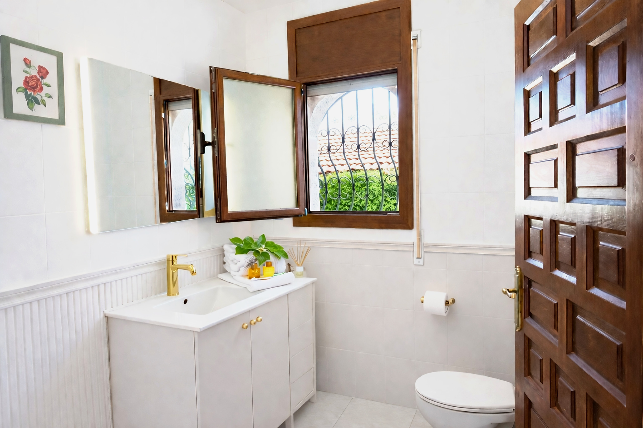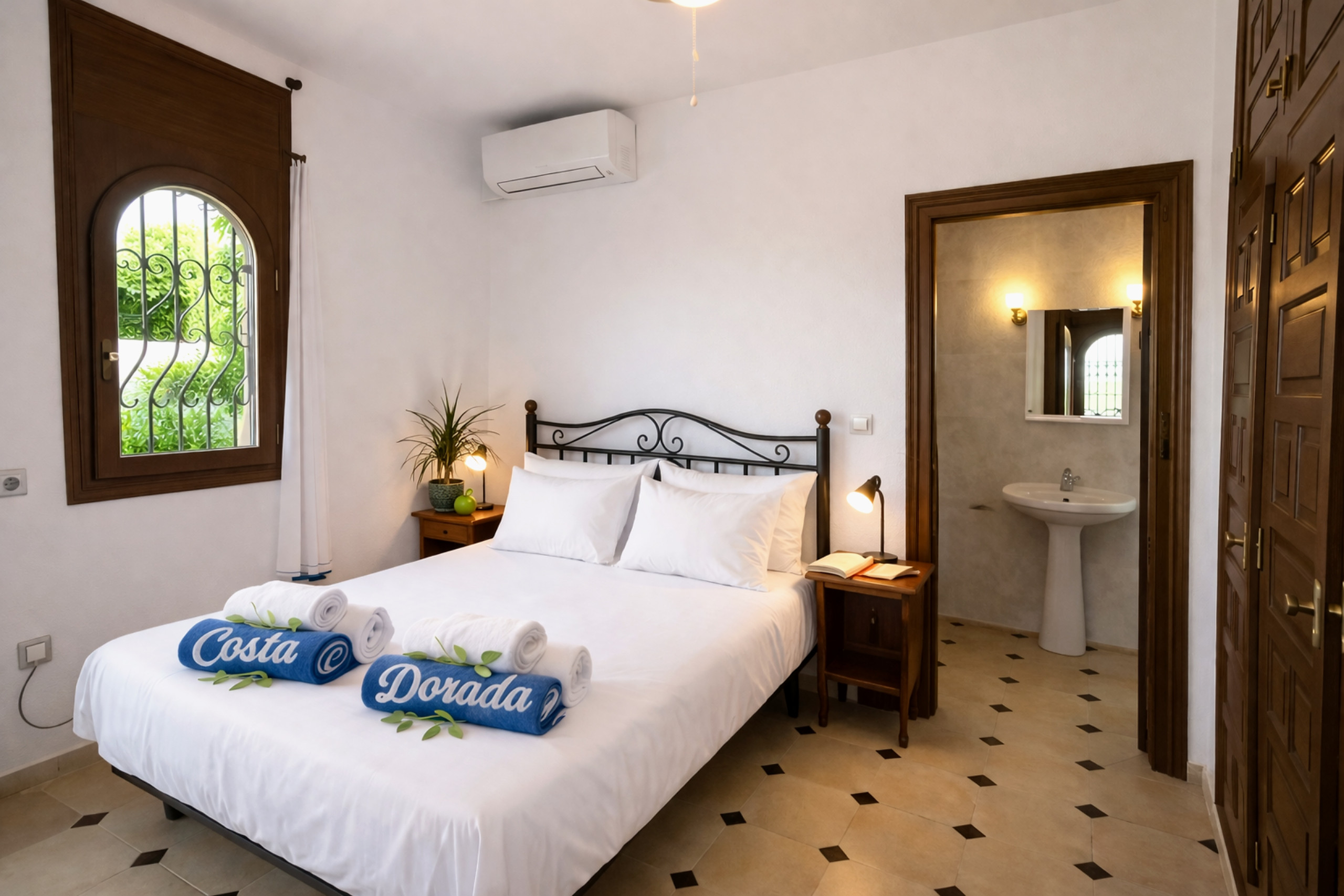 La vivienda está pensada para convivir cómodamente: tres dormitorios bien distribuidos, tres baños completos (dos con ducha y uno con bañera), cocina equipada y aire acondicionado en todas las estancias para los días más cálidos.