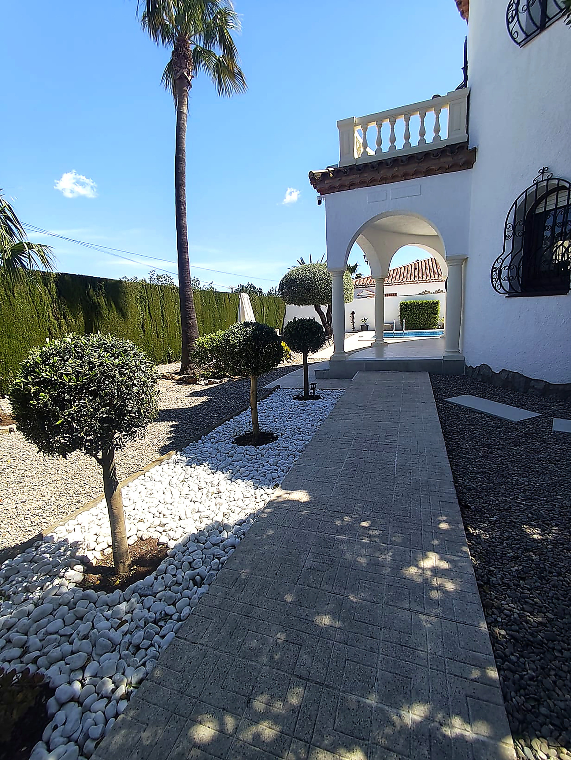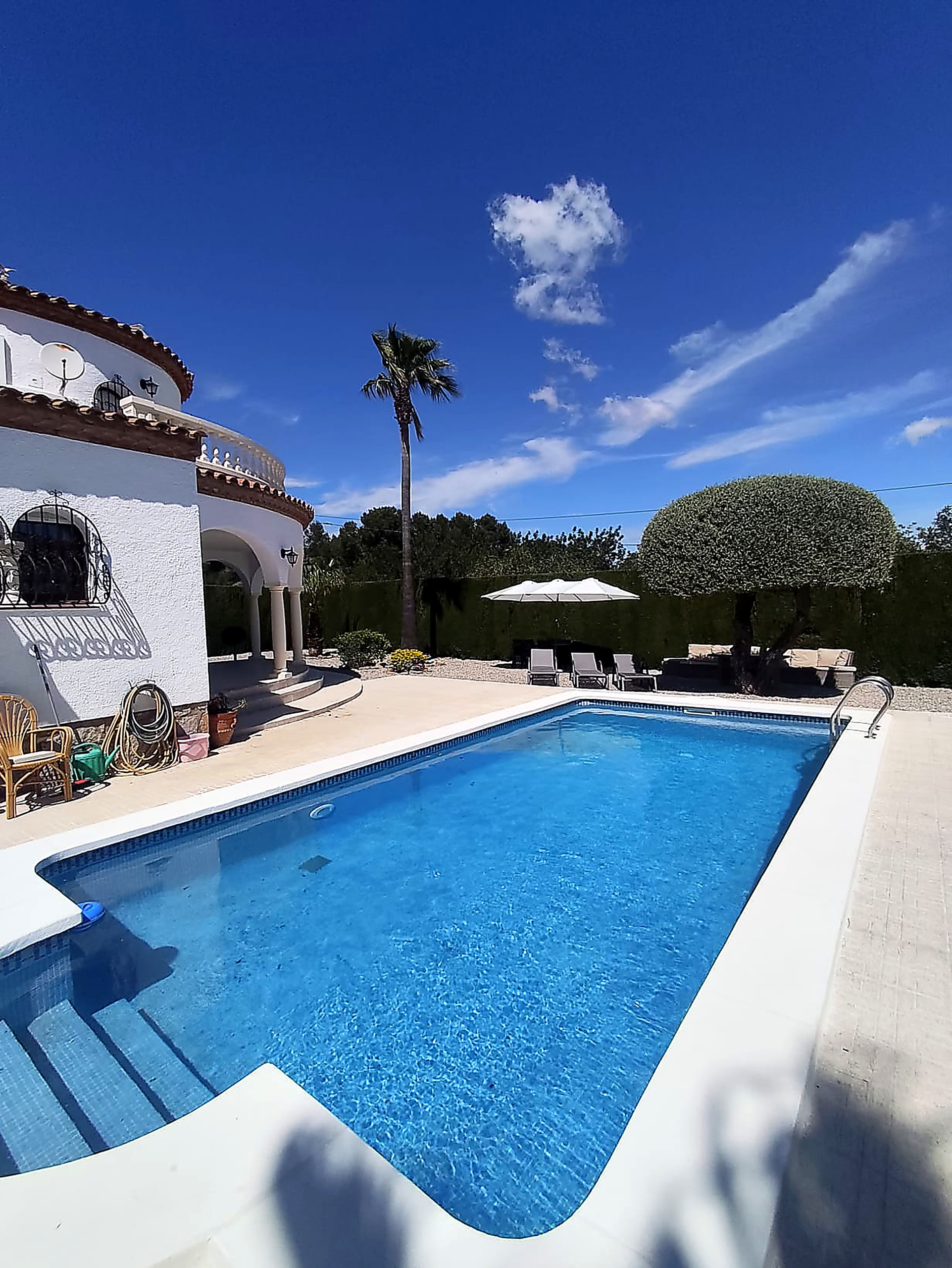 En el exterior es donde todo cobra sentido. Piscina privada, jardín y mobiliario para disfrutar sin prisas — desayunos al aire libre, tardes de descanso y cenas largas cuando cae el sol.